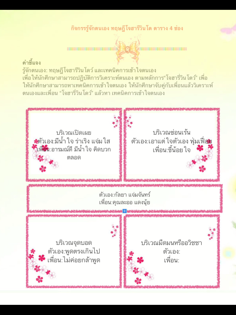กิจกรรมรู้จักตนเองทฤษฎีใจฮารีวินโดตาราง 4 ช่อง