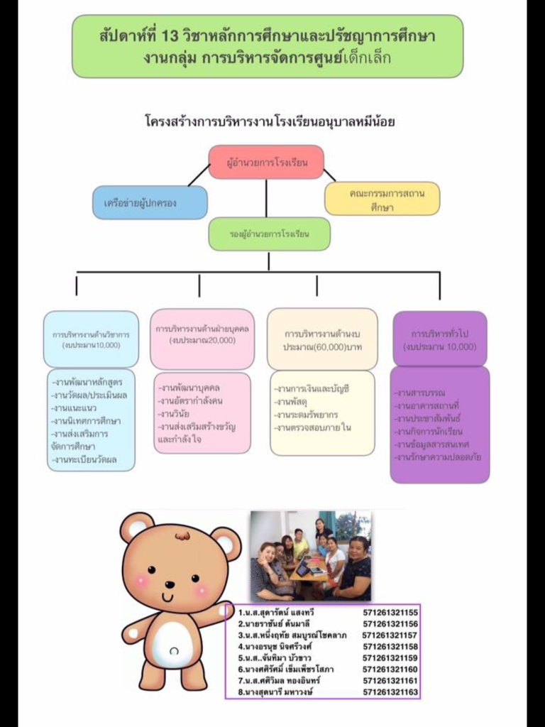สัปดาห์ที่ 14 งานกลุ่ม การบริหารจัดการศูนย์พัฒนาเด็กเล็กอนุบาลหมีน้อย