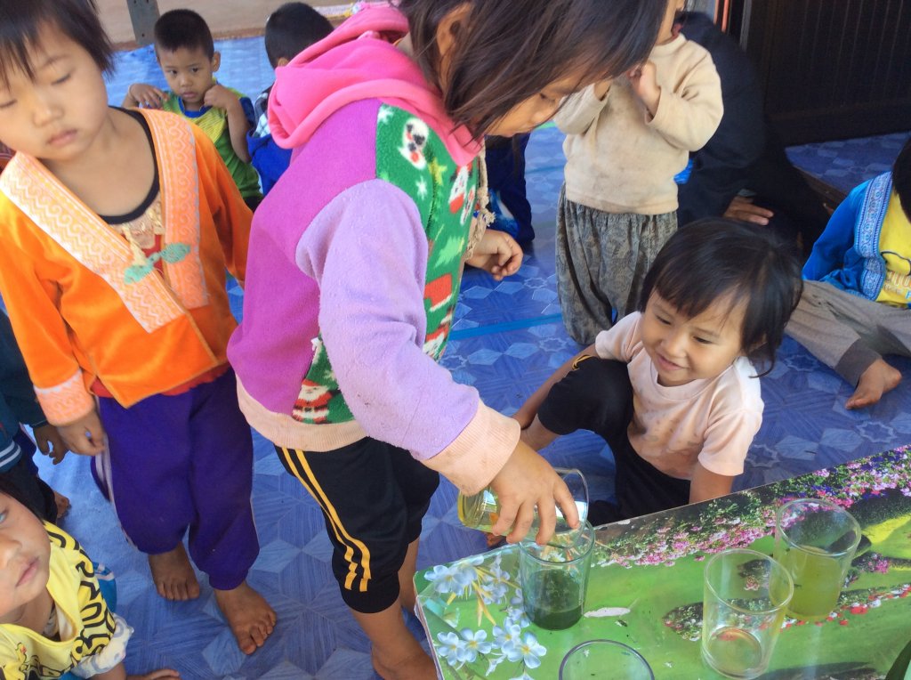 สีเขียวจากการเอาน้ำดอกอัญชันผสมกับน้ำขมิ้น