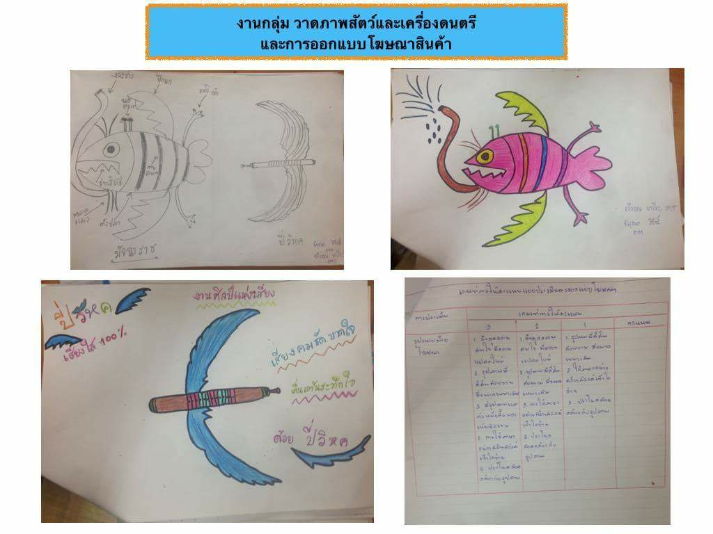 งานกลุ่ม การวาดภาพสัตว์และเครื่องดนตรี และการออกแบบโฆษณาสินค้า