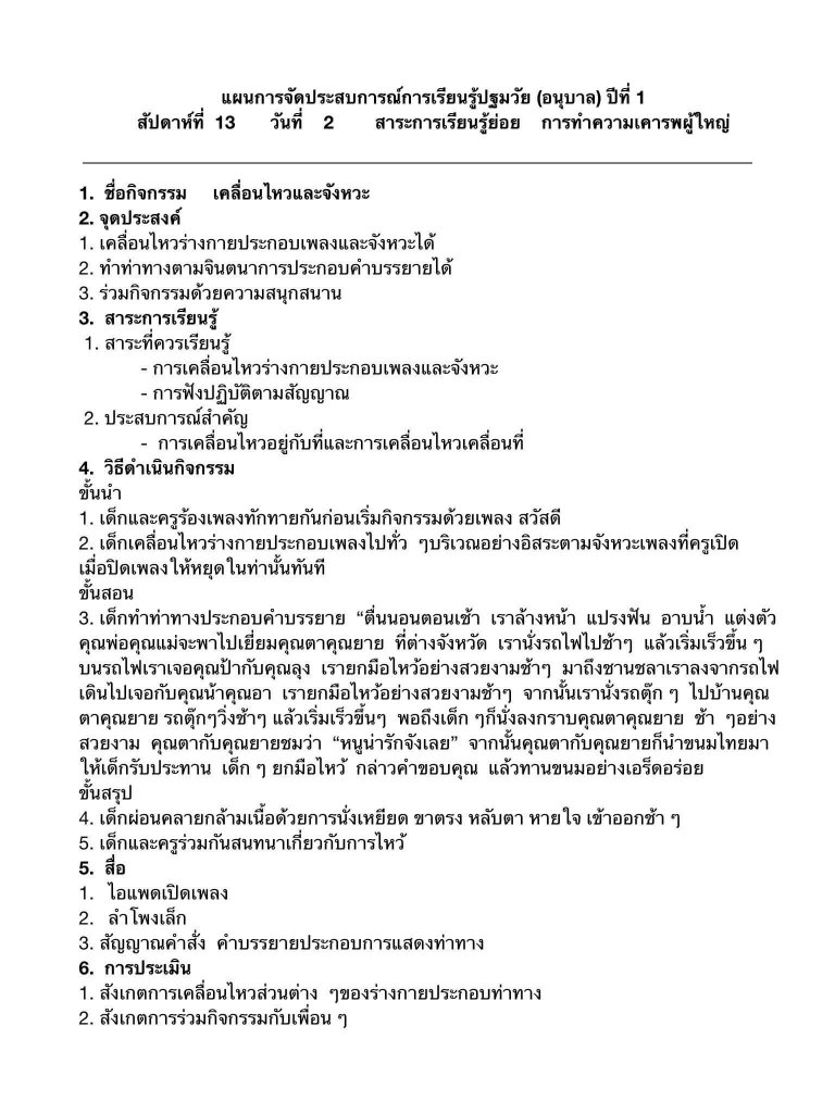 แผนการจัดประสบการณ์ กิจกรรมเคลื่อนไหวและจังหวะ