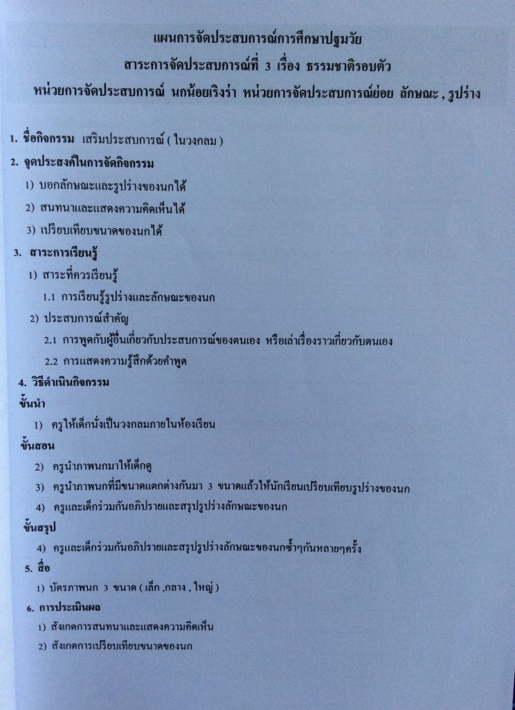 แผนการสอน หน่อยนกน้อยเริงร่า หน่วยย่อย ลักษณะ,รูปร่าง กิจกรรมเสริมประสบการณ์