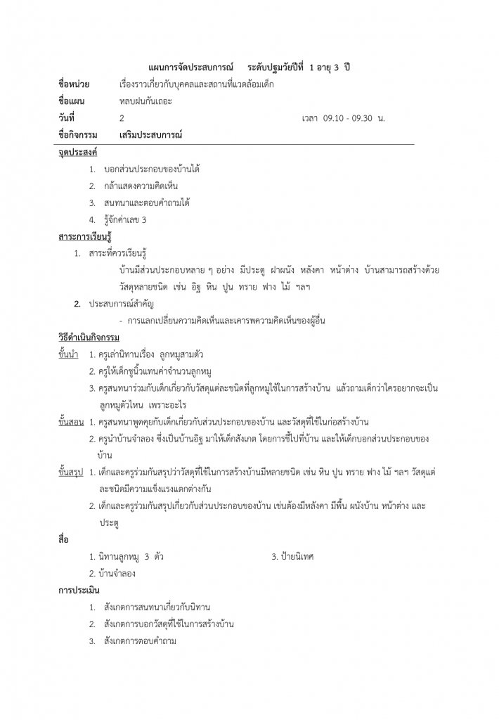 แผนการจัดประสบการณ์ หน่วย บ้านของหนู