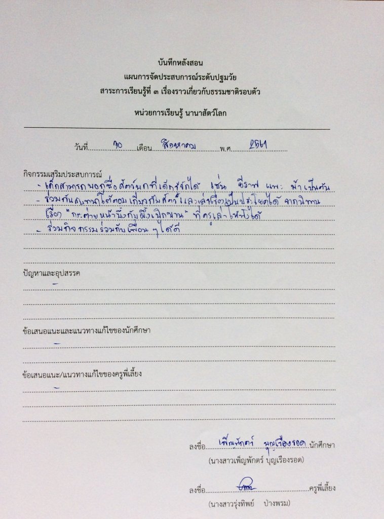 บันทึกหลังการจัดประสบการณ์ หน่วย นานาสัตว์โลก กิจกรรมเสริมประสบการณ์