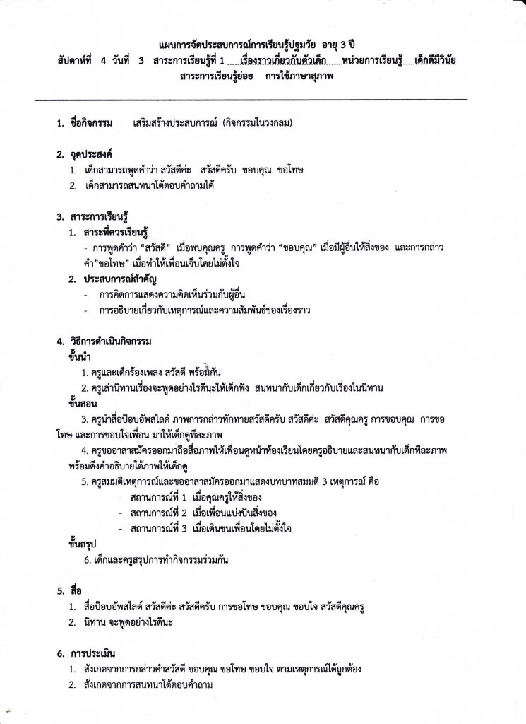 แผนการจัดประสบการณ์. หน่วยเด็กดีมีวินัย กิจกรรมเสริมประสบการณ์ ( การใช้ภาษาสุภาพ)
