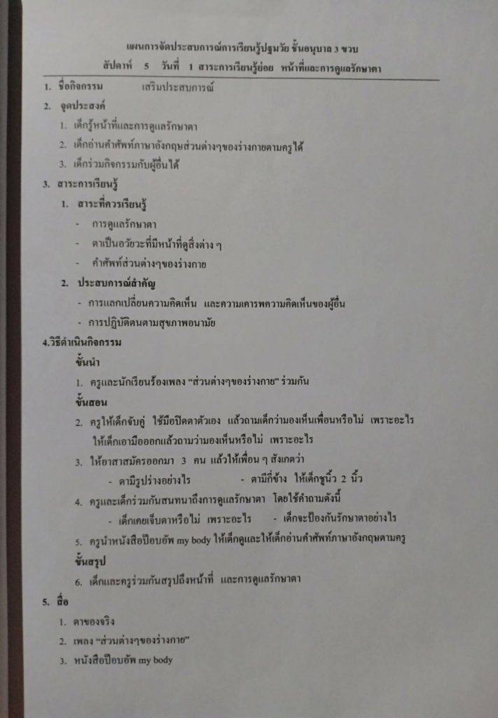 แผนการจัดประสบการณ์ หน่วย อวัยวะและการดูแลรักษา