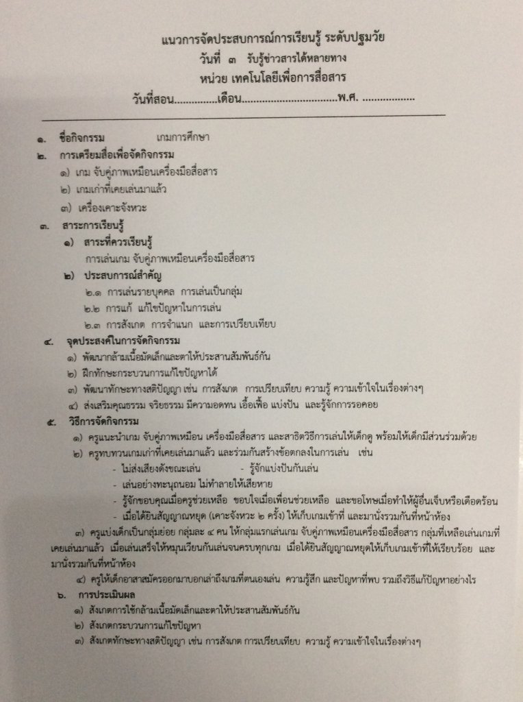แผนเสริมประสบการณ์ หน่วยเทคโนโลยีเพื่อการสื่อสาร กิจกรรม เกมการศึกษา