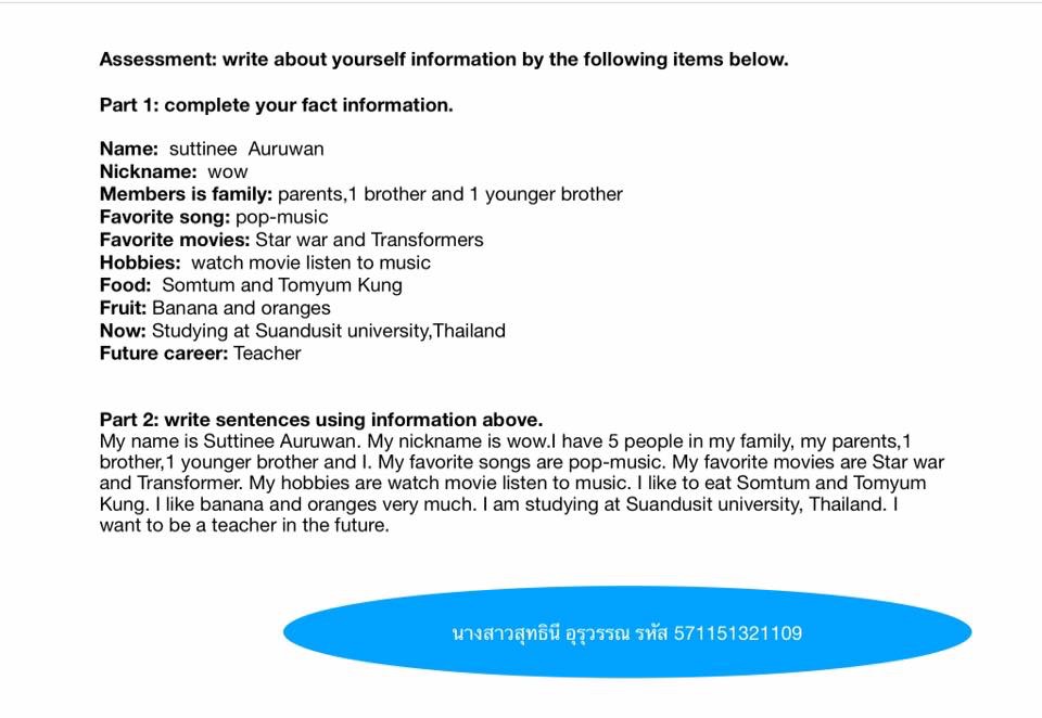 สัปดาห์ที่ 7 Assessment:Writ about yourself information by the following items below