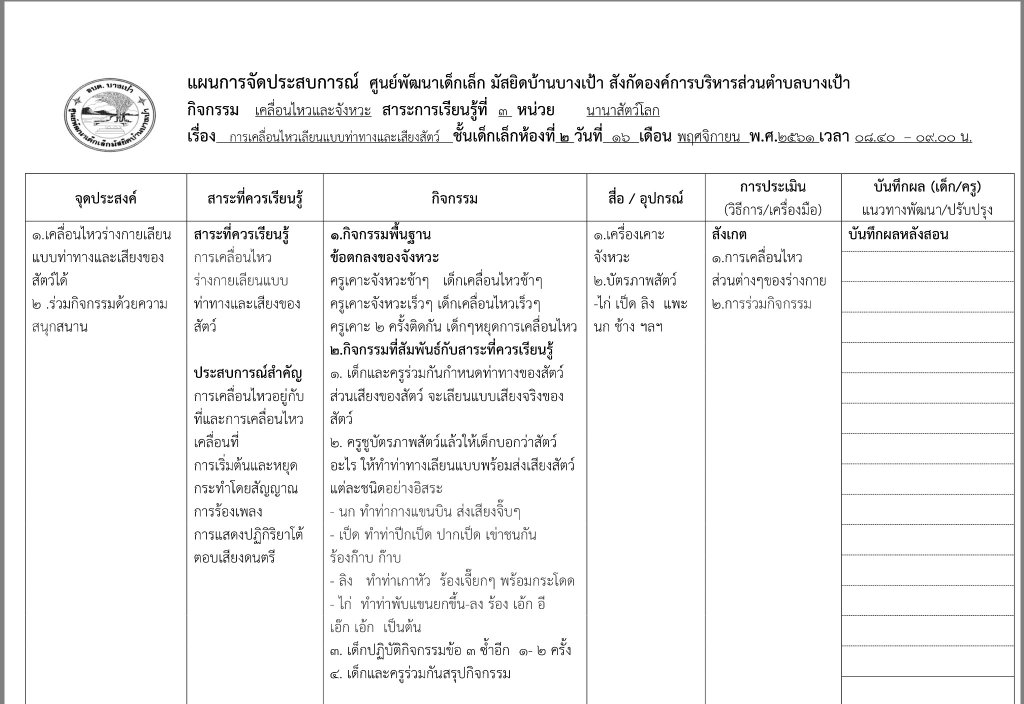 แผนการจัดประสบการณ์ กิจกรรมเคลื่อนไหวและจังหวะ