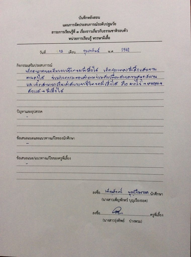 บันทึกหลังการจัดประสบการณ์กิจกรรมเสริมประสบการณ์หน่วยหรรษาผีเสื้อ