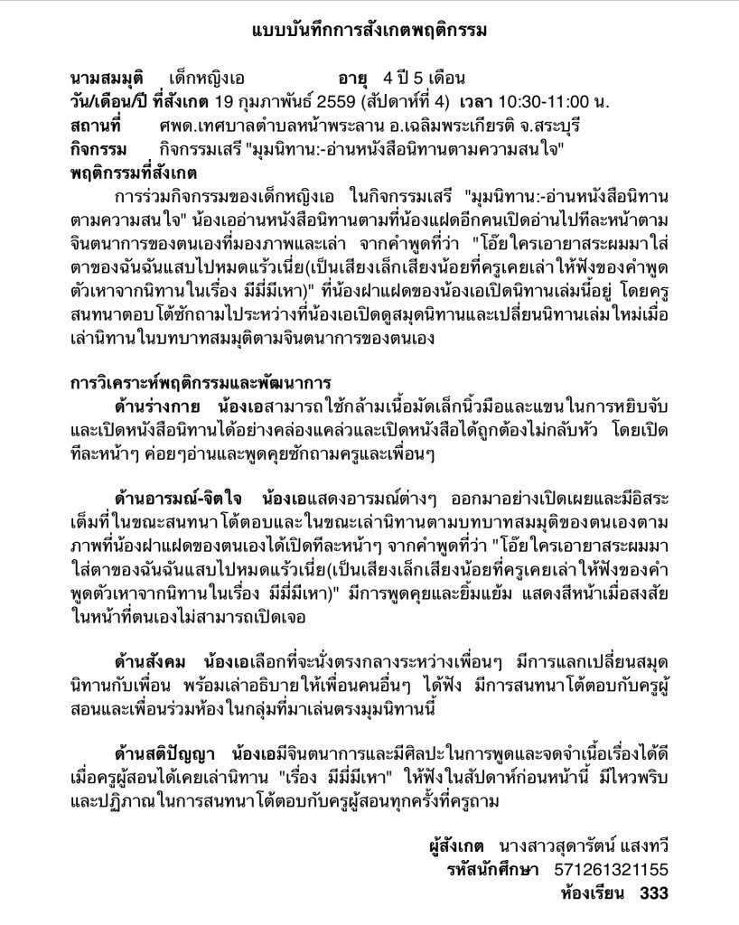 สัปดาห์ที่ 4 งานเดี่ยว การสังเกตพฤติกรรมเด็กในชั้นเรียน