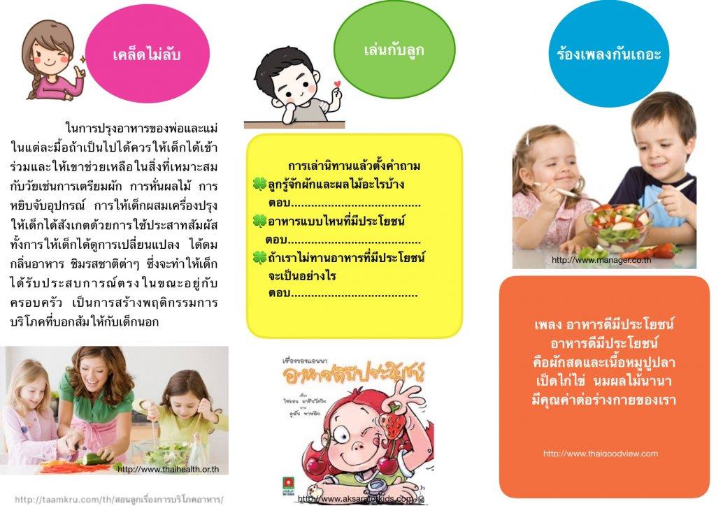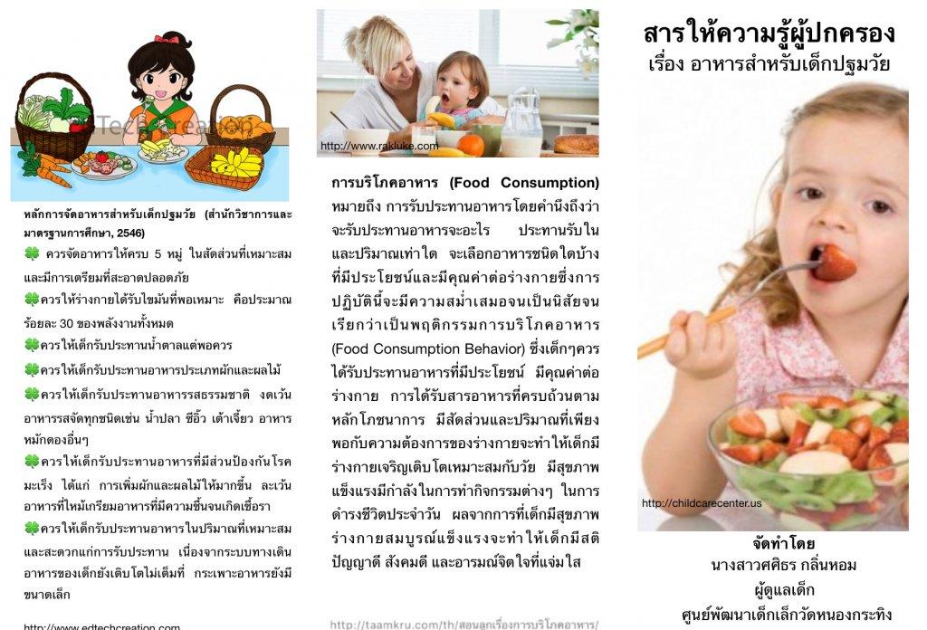 การรับประทานอาหารโดยคำนึงถึงว่าจะรับประทานอาหารจะอะไร ประทานรับในและปริมาณเท่าใด จะเลือกอาหารชนิดใดบ้างที่มีประโยชน์และมีคุณค่าต่อร่างกายซึ่งการปฏิบัตินี้จะมีความสม่ำเสมอจนเป็นนิสัยจนเรียกว่าเป็นพฤติกรรมการบริโภคอาหาร (Food Consumption Behavior) ซึ่งเด็กๆควรได้รับประทานอาหารที่มีประโยชน์ มีคุณค่าต่อร่างกาย การได้รับสารอาหารที่ครบถ้วนตามหลักโภชนาการ มีสัดส่วนและปริมาณที่เพียงพอกับความต้องการของร่างกายจะทำให้เด็กมีร่างกายเจริญเติบโตเหมาะสมกับวัย มีสุขภาพแข็งแรงมีกำลังในการทำกิจกรรมต่างๆ ในการดำรงชีวิตประจำวัน ผลจากการที่เด็กมีสุขภาพร่างกายสมบูรณ์แข็งแรงจะทำให้เด็กมีสติปัญญาดี สังคมดี และอารมณ์จิตใจที่แจ่มใส ผู้ปกครองจะได้นำความรู้ที่ได้ไปปรับใช้กับบุตรหลาน ประเมินความรู้ว่าเข้าใจและนำไปปรับใช้มากน้อยเพียงใดโดยการตอบคำถามหลังแผ่นพับ