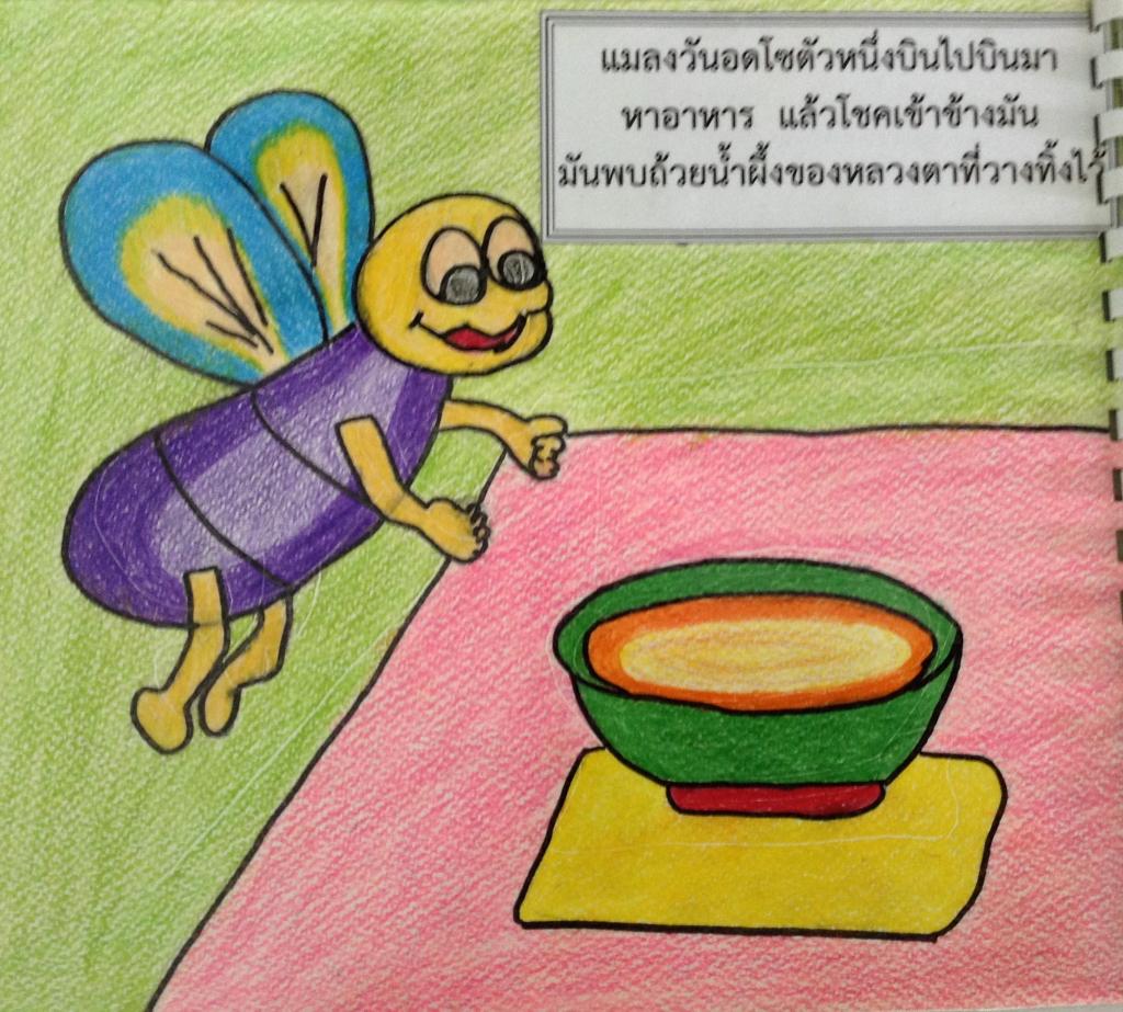 แมลงวันอดโซตัวหนึ่งบินไปบินมาหาอาหาร แล้วโชคก็เข้าข้างมัน มันพบถ้วยน้ำผึ้งของหลวงตาที่วางทิ้งไว้