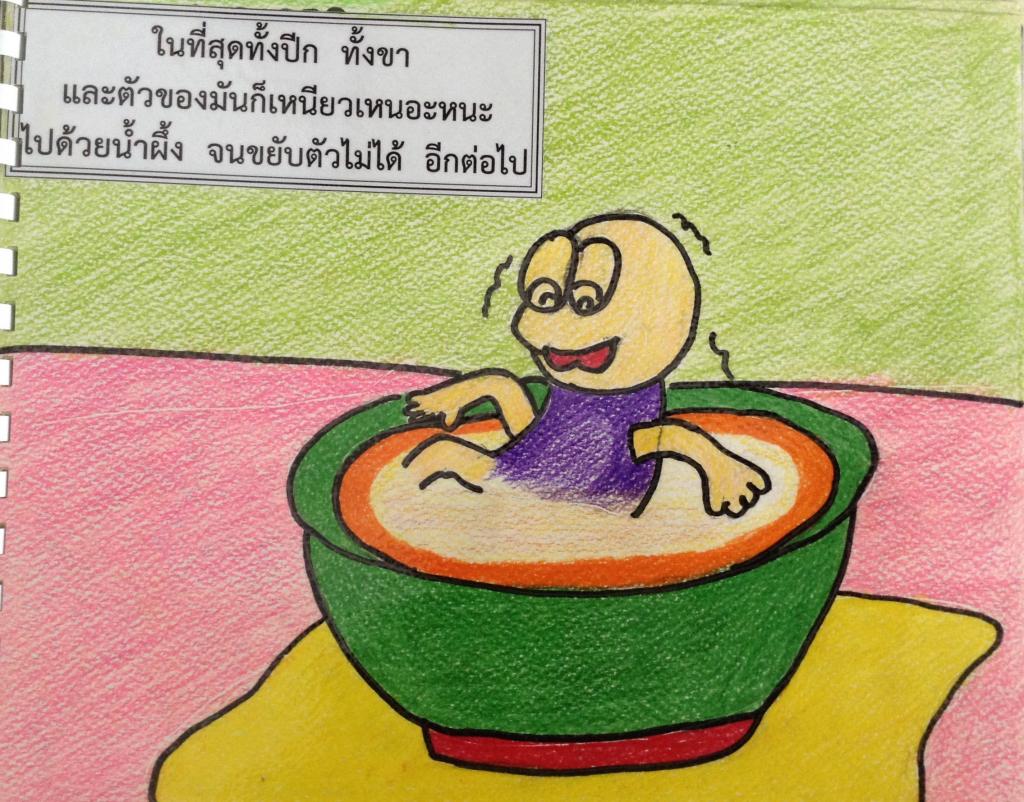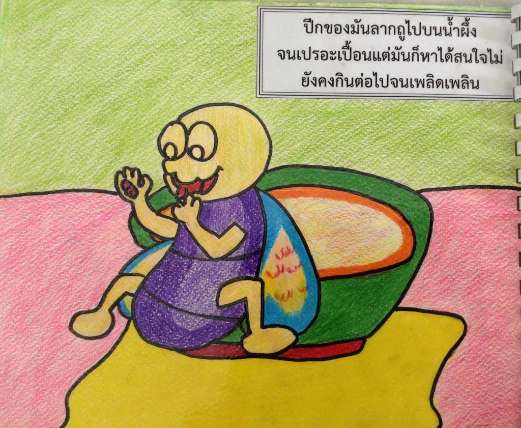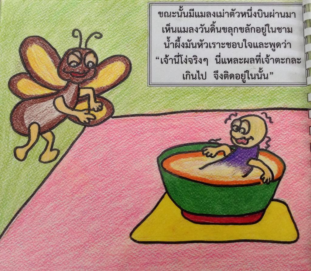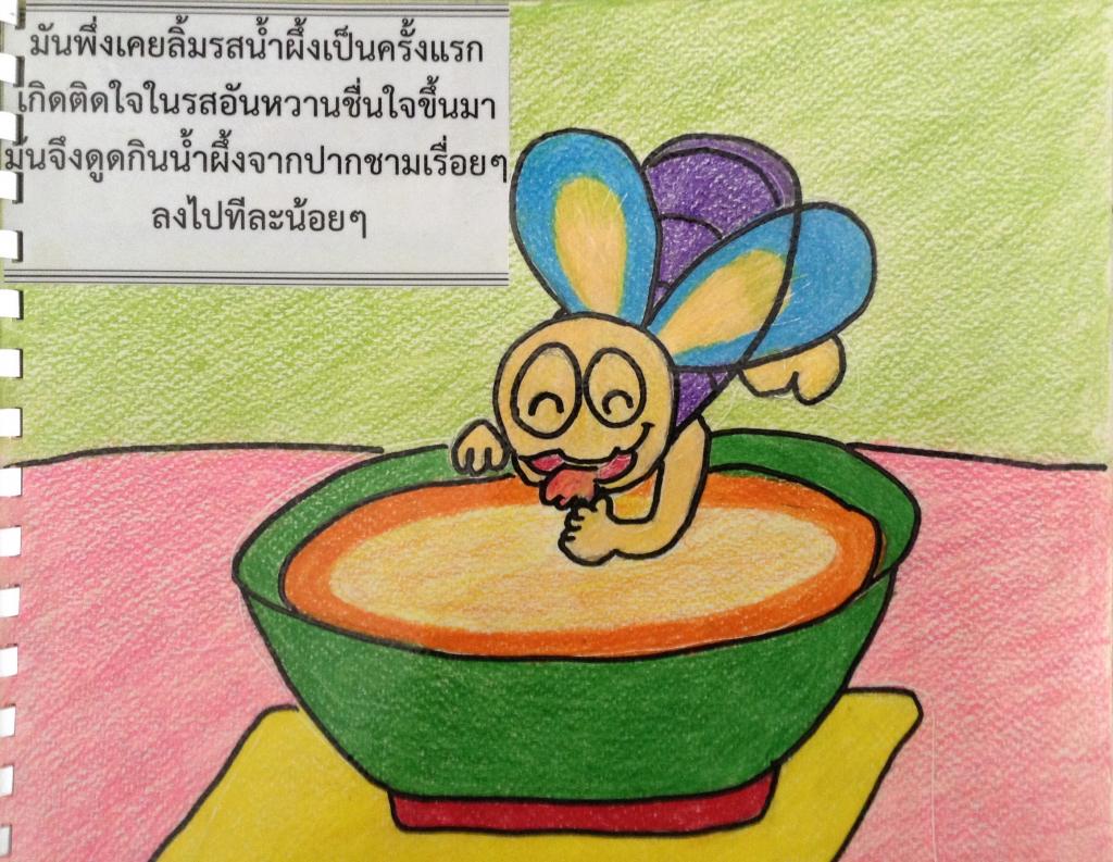 มันพึ่งเคยลิ้มรสน้ำผึ้งเป็นครั้งแรก เกิดติดใจในรสอันหวานชื่นใจขึ้นมา มันจึงดูดกินน้ำผึ้งจากปากชามเรื่อยๆ ลงไปทีละน้อยๆ ปีกของมันลากถูไปบนน้ำผึ้งจนเปรอะเปื้อนแต่มันก็หาได้สนใจไม่ยังคงกินต่อไปจนเพลิดเพลิน