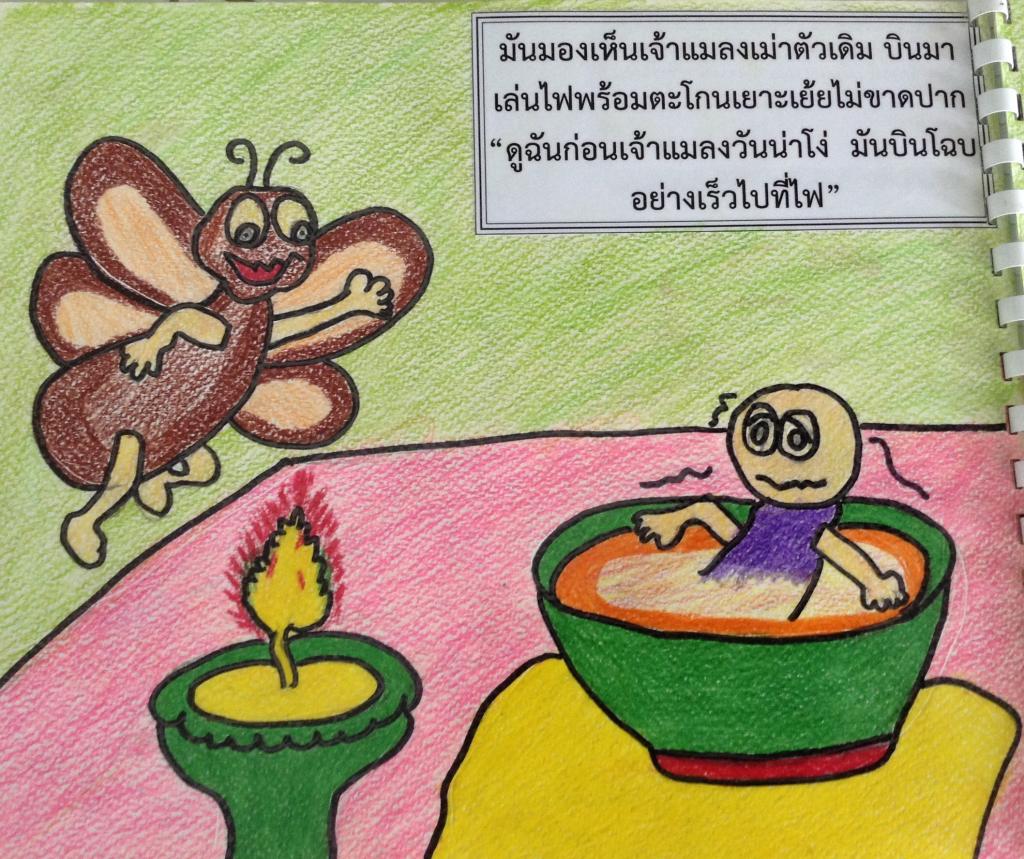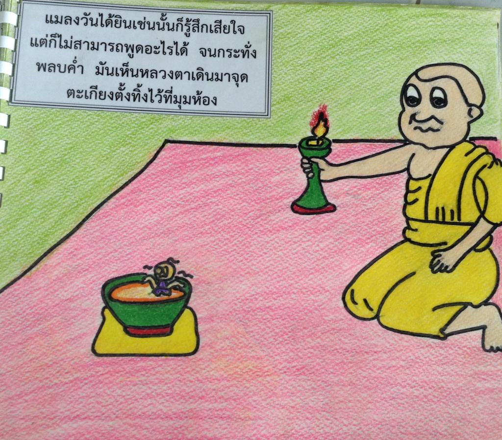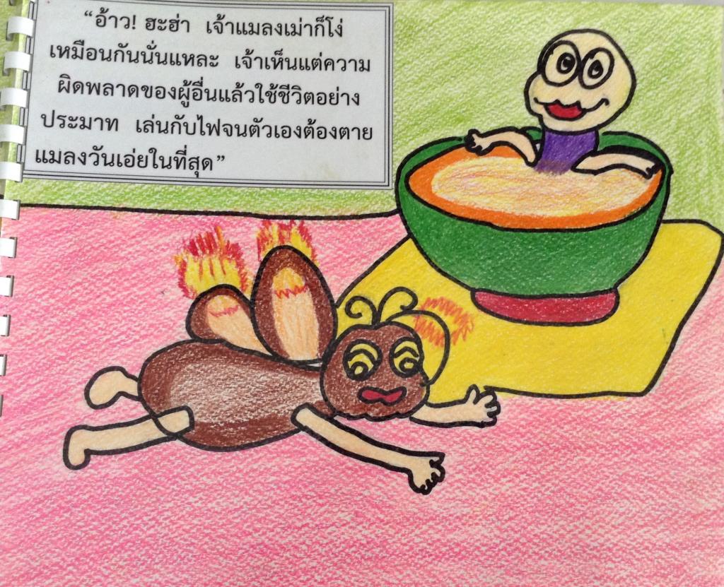 ในที่สุดทั้งปีก ทั้งขา และตัวของมันก็เหนียวเหนอะหนะไปด้วยน้ำผึ้ง จนขยับตัวไม่ได้อีกต่อไป ขณะนั้นมีแมลงเม่าตัวหนึ่งบินผ่านมาเห็นแมลงวันดิ้นขลุกขลักอยู่ในชามน้ำผึ้งมันหัวเราะชอบใจและพูดว่า "เจ้านี่โง่จริงๆ นี่แหละผลที่เจ้าตะกละเกินไปจึงติดอยู่ในนั้น" แมลงวันได้ยินเช่นนั้นก็รู้สึกเสียใจแต่ก็ไม่สามารถพูดอะไรได้ จนกระทั่งพลบค่ำ มันเห็นหลวงตาเดินมาจุดตะเกียงตั้งทิ้งไว้ที่มุมห้อง มันมองเห็นเจ้าแมลงเม่าตัวเดิม บินมาเล่นไฟพร้อมตะโกนเยาะเย้ยไม่ขาดปาก "ดูฉันก่อนเจ้าแมลงวันน่าโง่ มันบินโฉบอย่างเร็วไปที่ไฟ" เจ้าแมลงเม่าบินไปรอบๆ ส่งเสียงเยาะเย้ยอย่างน่ารำคาญ ด้วยความเร็ว เจ้าแมลงวันมองดูจนตาลาย ในที่สุดปีกของเจ้าแมลงเม่าก็ปะทะเข้ากับเปลวไฟจนลุกไหม้ มันตกลงมาใกล้ๆ ชามน้ำผึ้ง ที่แมลงวันติดอยู่ "อ้าว! ฮะฮ่า เจ้าแมลงเม่าก็โง่เหมือนกันนั่นแหละ เจ้าเห็นแต่ความผิดพลาดของผู้อื่นแล้วใช้ชีวิตอย่างประมาท เล่นกับไฟจนตัวเองต้องตาย แมลงวันเอ่ยในที่สุด