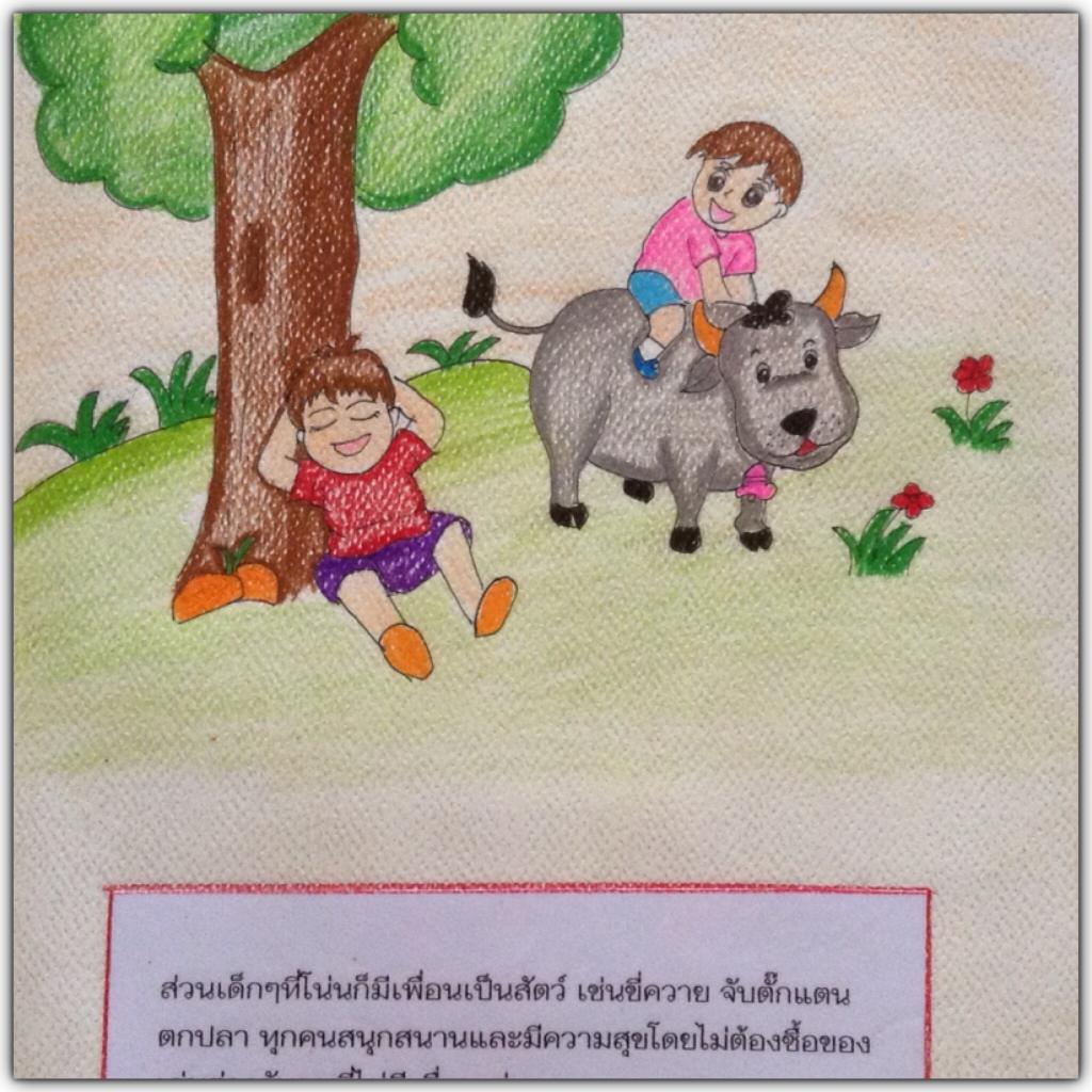"ส่วนเด็กๆที่โน่นก็มีเพื่อนเป็นสัตว์ เช่นขี่ควาย จับตั๊กแตน ตกปลา ทุกคนสนุกสนานและมีความสุขโดยไม่ต้องซื้อของเล่น ต่างกับผมที่ไม่มีเพื่อนเล่นต้องนั่งดูทีวีเป็นเพื่อนเล่น"