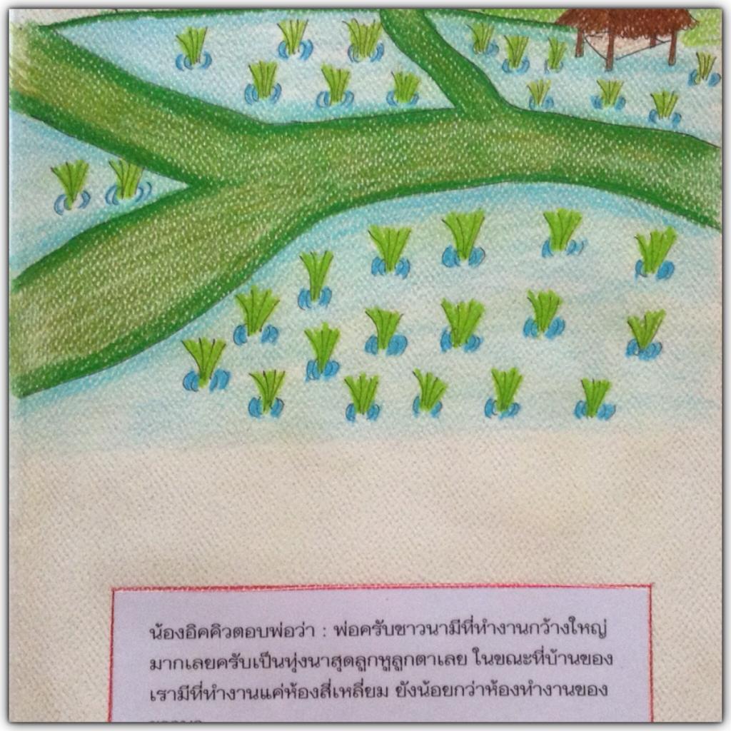 น้องอิคคิว: ตอบพ่อว่า พ่อครับชาวนามีที่ทำงานกว้างใหญ่มากเลยครับเป็นท้องนาสุดลูกหูลูกตาเลย ในขณะที่เรามีห้องทำงานแค่ห้องสี่เหลี่ยม ยังน้อยกว่าห้องทำงานของชาวนา