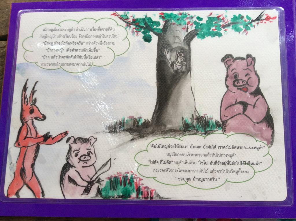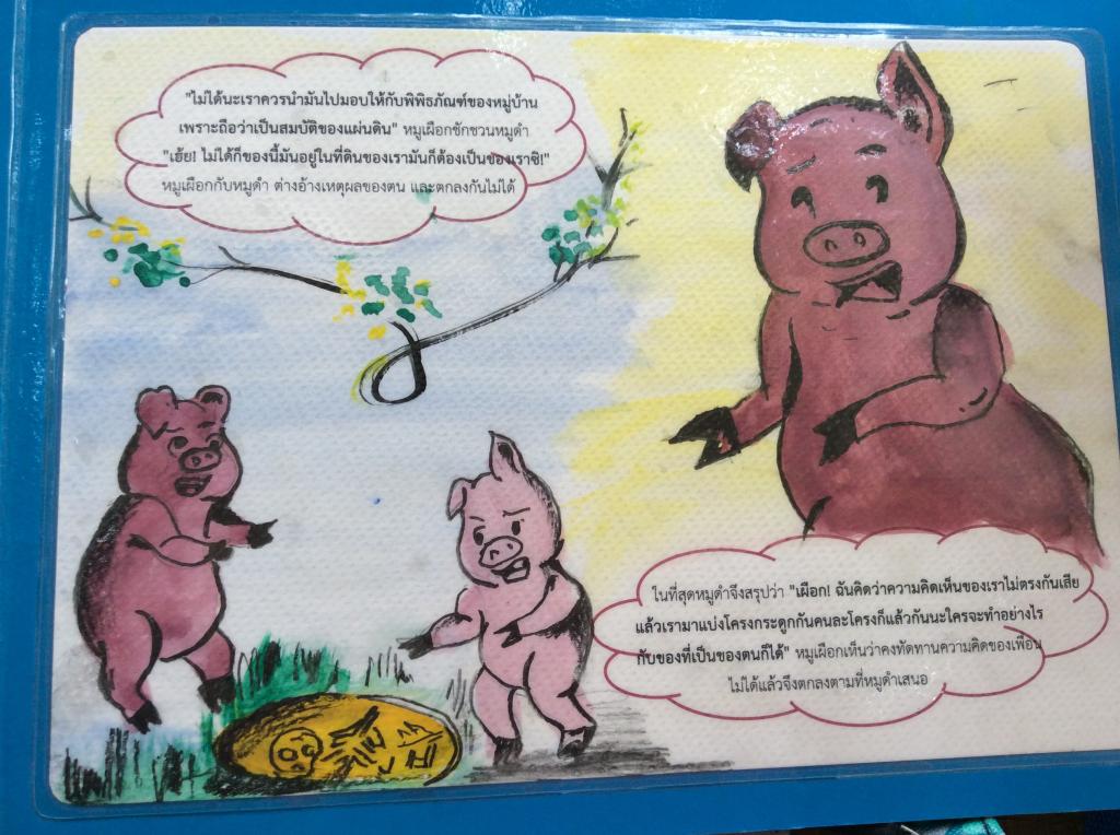 " เฮ้ย! ไม่ได้ก็ของนี้มันอยู่ในที่ดินของเรามันก็ต้องเป็นของเราซิ! " หมูเผือกกับหมูดำ ต่างอ้างเหตุผลของตน และตกลงกันไม่ได้.