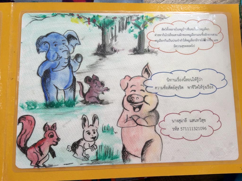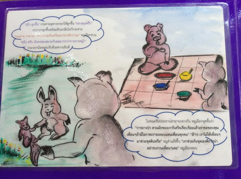 " กระต่าย กระรอก เราไปช่วยกันเตรียมอาหารดีกว่านะ " หมูเผือกชวน