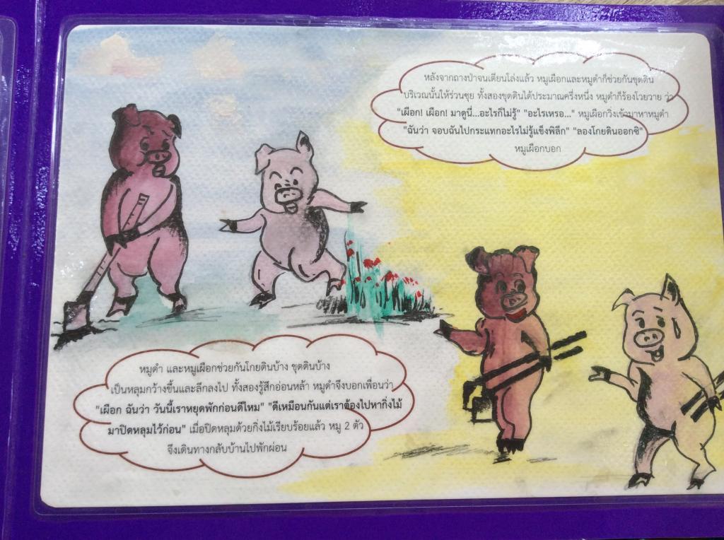 " เราช่วยกันขุดเองดีกว่าน่า อย่ารบกวนเพื่อนๆเลย " หมูเผือกตอบ.