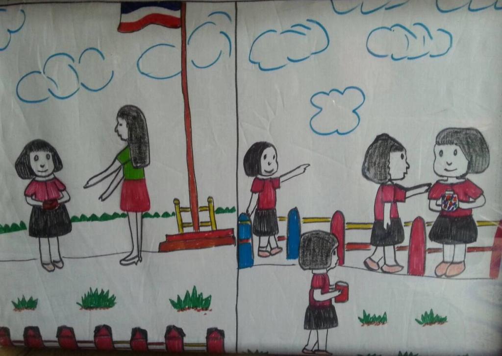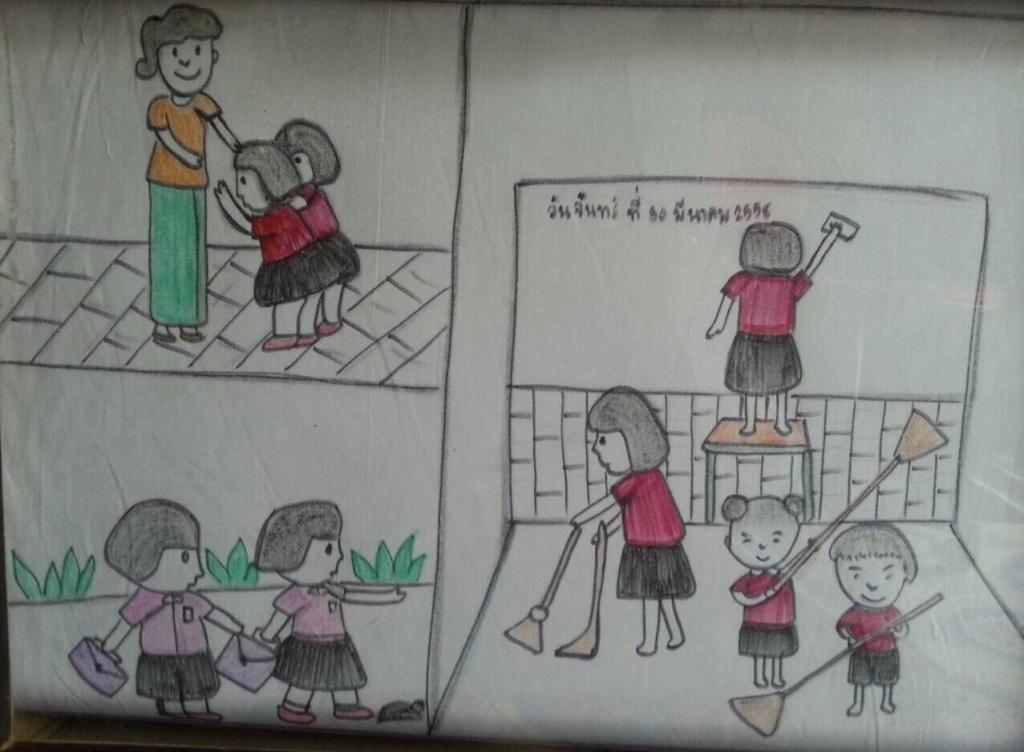(3)พอถึงโรงเรียนแก้วเกล้าก็ช่วยเพื่อนทำความสะอาดห้อง เก็บขยะ แก้วเกล้าเป็นเด็กดีมีน้ำใจช่วยเหลือเพื่อนๆและคุณครูตลอด ไม่แกล้งเพื่อน มี(2)วันหนึ่งน้องเกล้าเก็บตังได้ พี่แก้วก็เลยบอกให้น้องเกล้าเอาไปให้คุณครูตามหาเจ้าของ พี่แก้วจะคอยสอนน้องเกล้าอยู่เสมอว่าอย่าเอาของคนอื่นมาเป็นของตัวเอง อย่าขโมยของคนอื่น