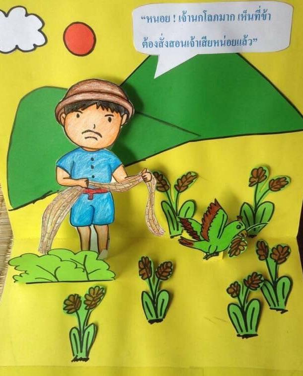 ชาวนาพูดว่า"หนอย! เจ้านกโลภมาก เห็นทีข้าคงต้องสั่งสอนเจ้าเสียหน่อยแล้ว"