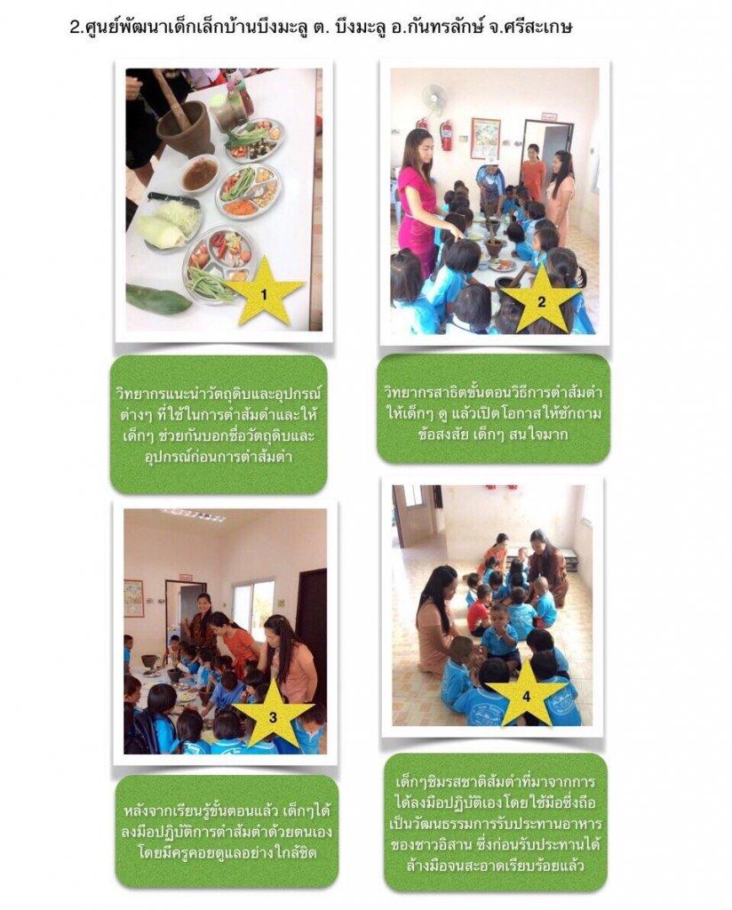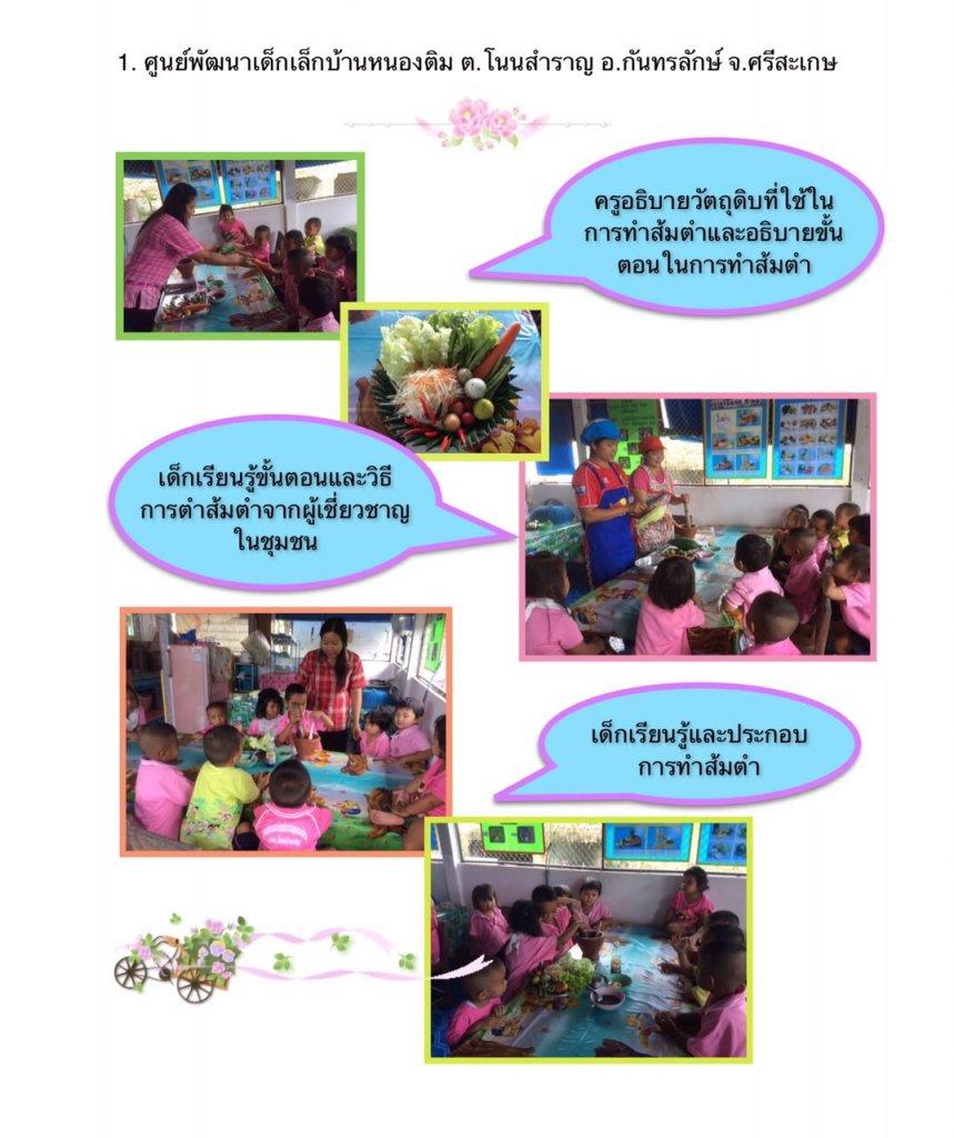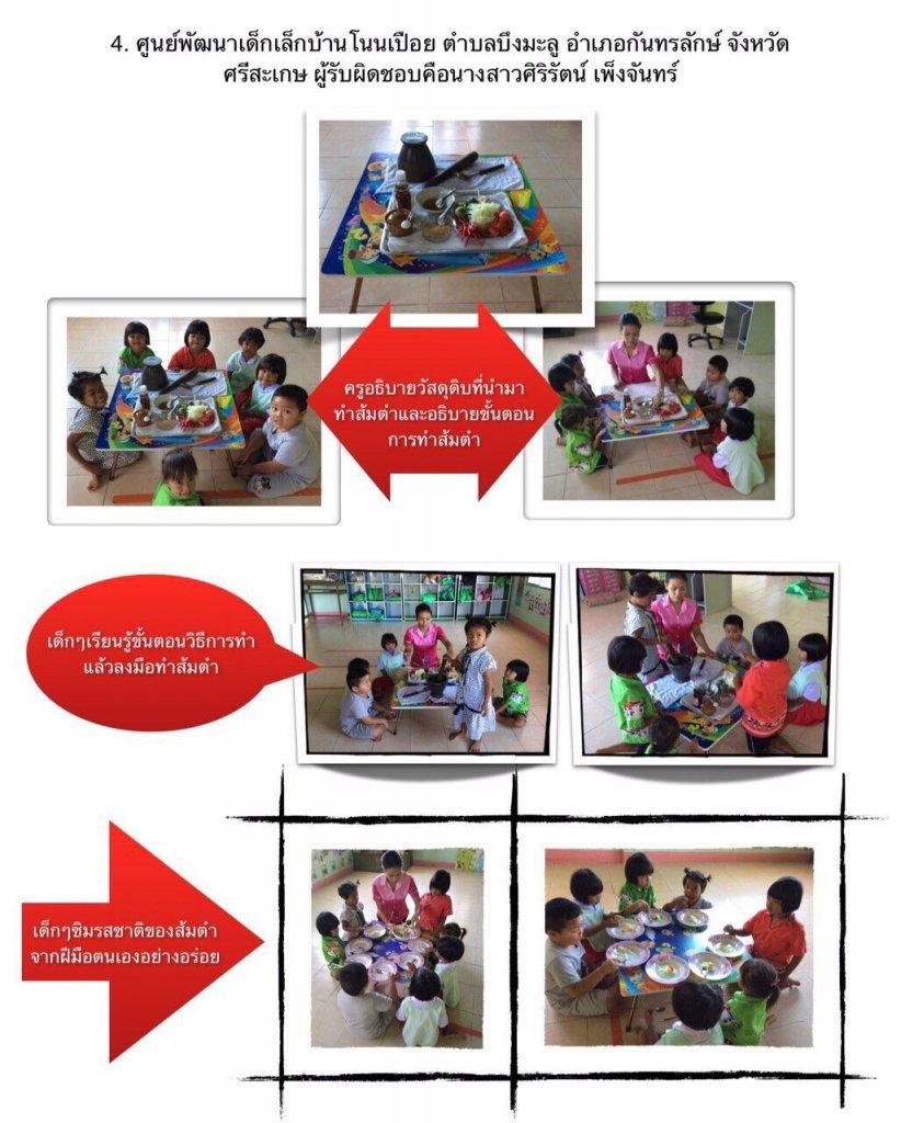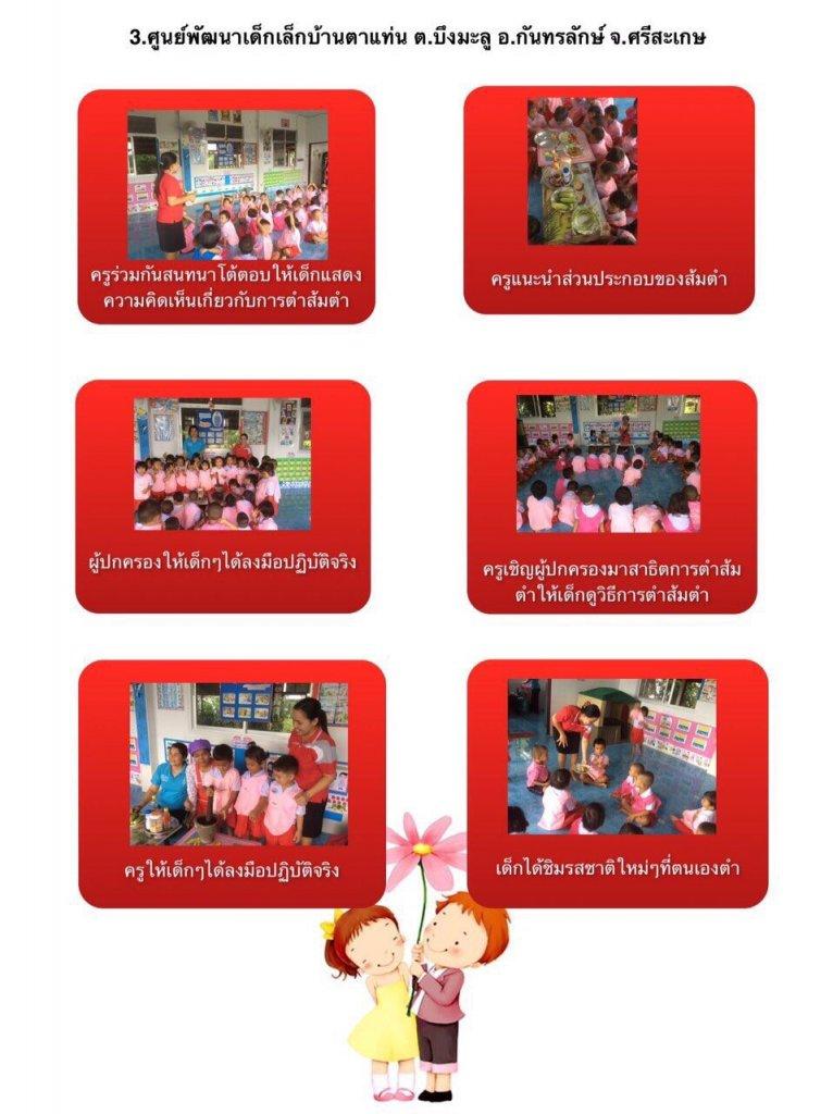 จากการนำกิจกรรมการเรียนรู้วิธีการตำส้มตำไปใช้ที่ศูนย์พัฒนาเด็กเล็ก เพื่อให้เด็กเกิดการเรียนรู้การทำงานเป็นกลุ่ม ได้ใช้ประสาทสัมผัสทั้ง 5 ครบทุกส่วนและได้ชิมรสชาติใหม่ๆส่งเสริมการสังเกตและเปรียบเทียบจากของจริง วัสดุสิ่งของต่างๆ และรูปภาพ ส่งเสริมการใช้ความคิดอย่างมีเหตุผล การตัดสินใจแก้ปัญหา ส่งเสริมการใช้กล้ามเนื้อมัดเล็ก-กล้ามเนื้อมัดใหญ่และการประสานสัมพันธ์ระหว่างมือกับตา เป็นการเรียนรู้การเข้าสังคม การแสดงพฤติกรรมจากการสนทนาถ้อยทีถ้อยอาศัยกัน ส่งเสริมให้มีความกล้าในการแสดงออก กล้าพูด กล้าคิด และเพื่อเป็นการปลูกฝังให้เด็กในศูนย์พัฒนาเด็กเล็กได้เห็นถึงประโยชน์และคุณค่าของส้มตำที่เป็นอาหารประจำท้องถิ่น