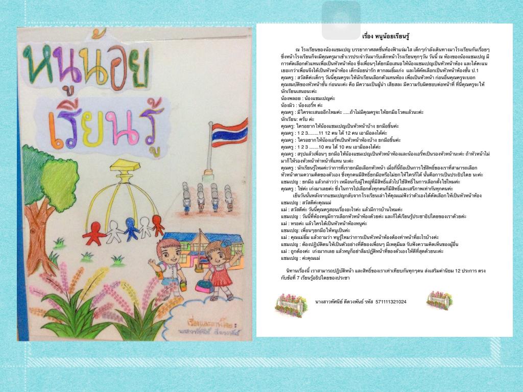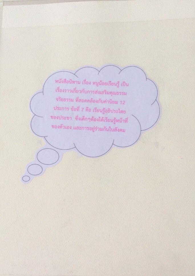 - แต่งนิทานเรื่อง หนูน้อยเรียนรู้ ที่สอดคล้องกับคุณธรรมจริยธรรม ค่านิยม 12 ประการ ข้อที่ 7 เรื่อง เรียนรู้อธิปไตยของประชา