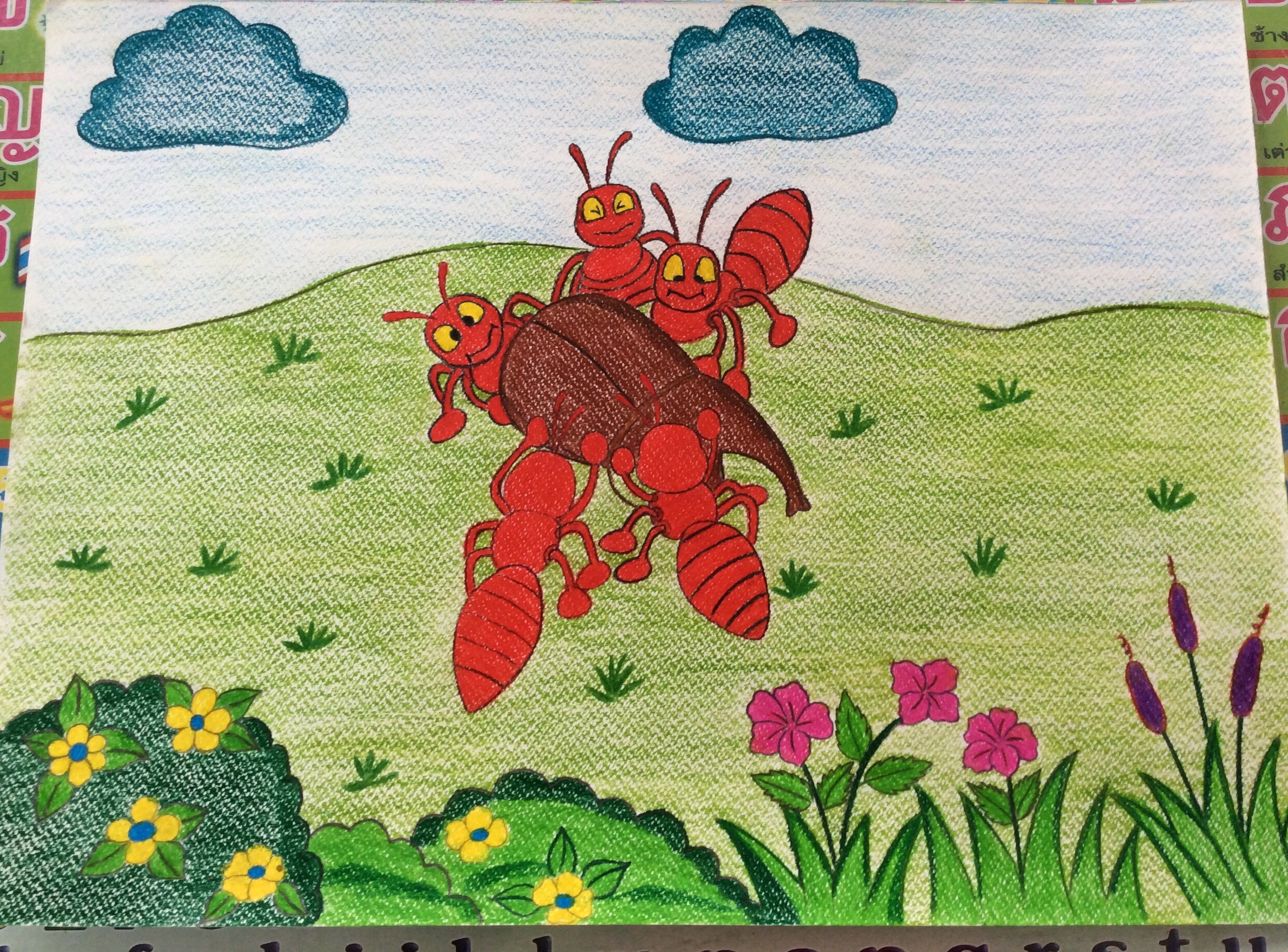 มดน้อย : พวกเรา พวกเรา มาเร็ว ฉันเจออาหารชิ้นใหญ่ พวกเรามาช่วยกัน ขนกลับบ้านกันเถอะ