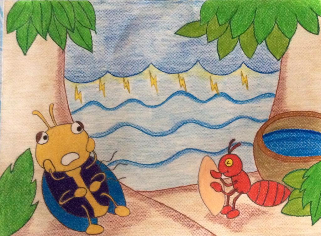 มดน้อย : จักจั่น วันนี้ฝนตกหนักจังเลย ฉันว่าจะออกไปหาอาหารแต่คงออกไปไม่ได้แล้ว แต่ก็ยังดีนะที่พวกฉันช่วยกันไปหาอาหารมาเก็บสะสมไว้ ถึงแม้ ฝนจะตก น้ำจะท่วม แต่พวกฉัน ก็ยังมีอาหารกิน