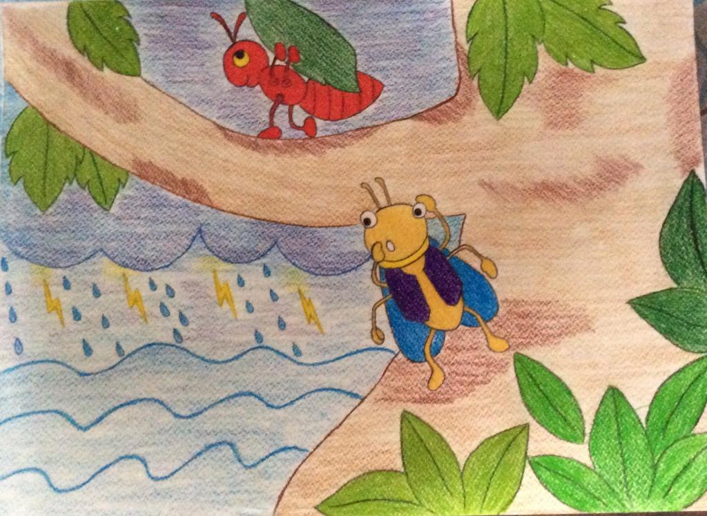 วันหนึ่งท้องฟ้ามืดครึ้ม ฝนตกหนัก จนน้ำท่วมป่า จักจั่นไปไหนไม่ได้ ส่วนเจ้ามดน้อยเดินไต่กิ่งไม้ไปมา และถามจักจั่นว่า