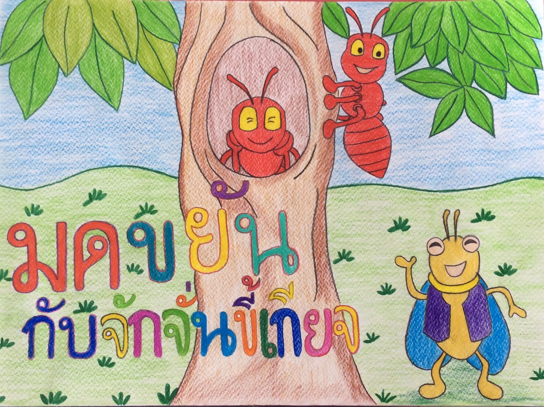 - แต่งนิทานเรื่อง มดขยันกับจักจั่นขี้เกียจ ที่สอดคล้องกับคุณธรรมจริยธรรม ค่านิยม 12 ประการ ข้อที่ 2 เรื่องความซื่อสัตย์เสียสละ อดทน