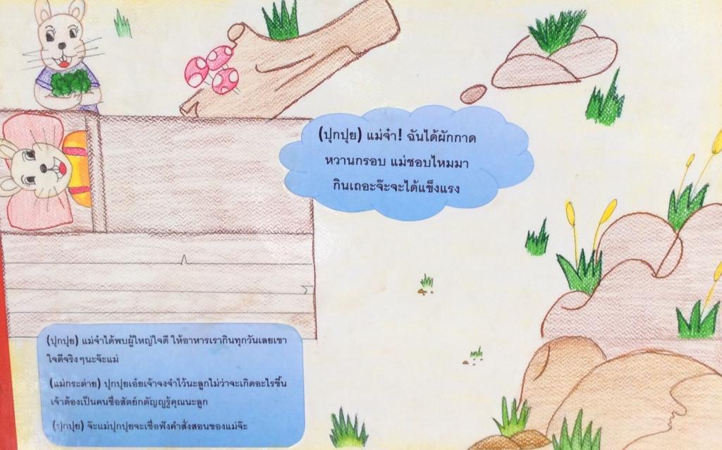 (แม่กระต่าย) ปุกปุยเอ๋ย เจ้าจงจำไว้นะลูกไม่ว่าอะไรจะเกิดขึ้น เจ้าต้องเป็นคนซื่อสัตย์ กตัญญูรู้คุณนะลูก