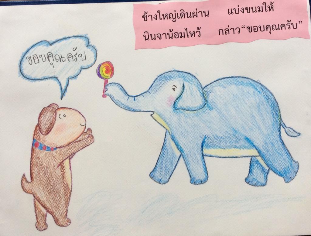 ช้างใหญ่เดินผ่าน แบ่งขนมให้ นินจาน้อมไหว้ กล่าว"ขอบคุณครับ"