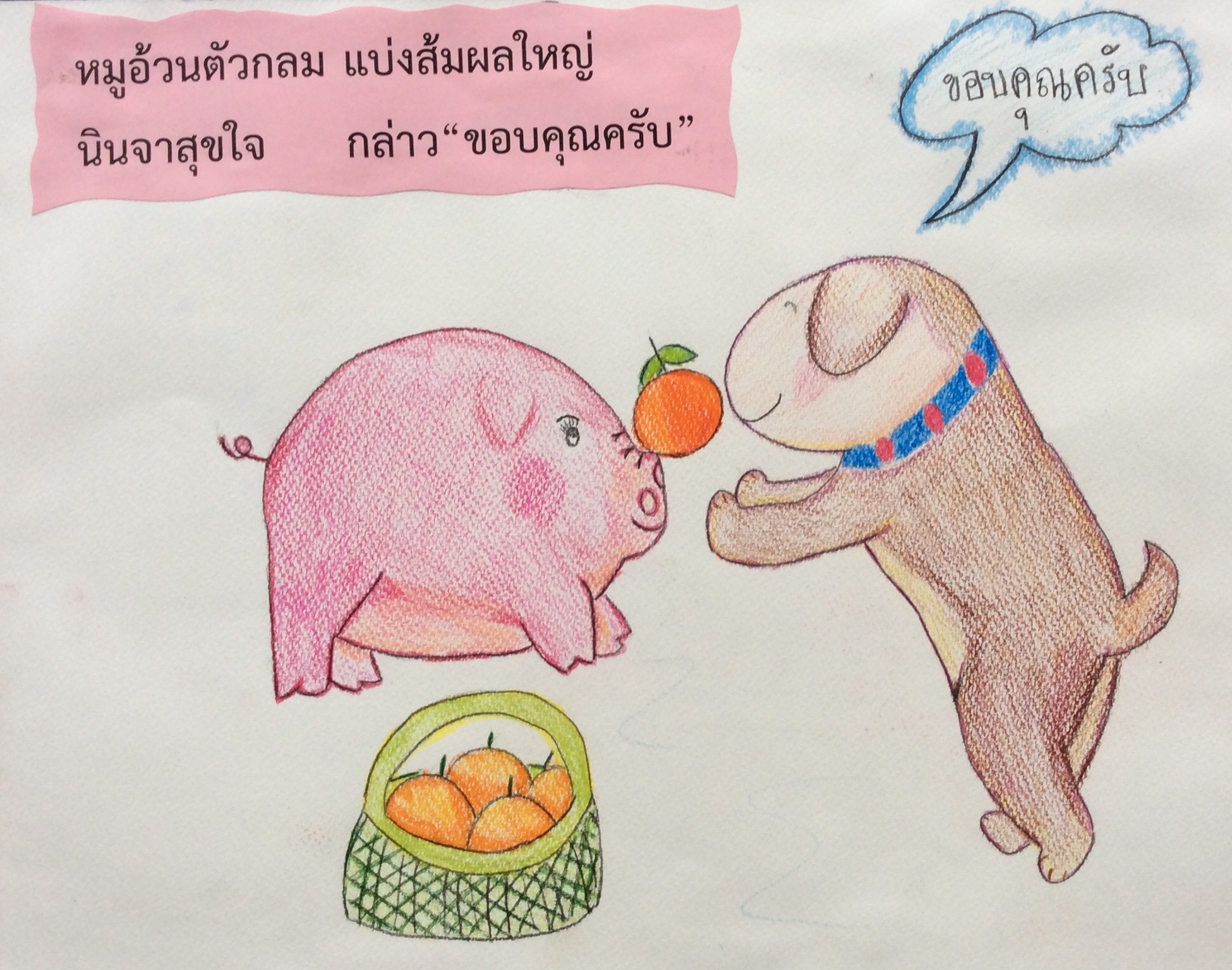 หมูอ้วนตัวกลม แบ่งส้มผลใหญ่ นินจาสุขใจ กล่าว"ขอบคุณครับ"