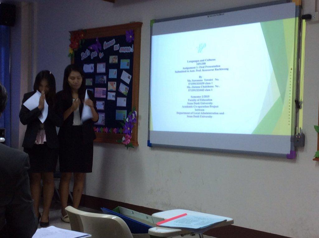 วิชา ภาษาและวัฒนธรรม สอบนำเสนองานOral Presentation เกี่ยวกับงานวิจัย และนำเสนองานวัฒนธรรมที่เกี่ยวกับด้านต่างๆพร้อมกับอธิบายสื่อเป็นกลุ่ม