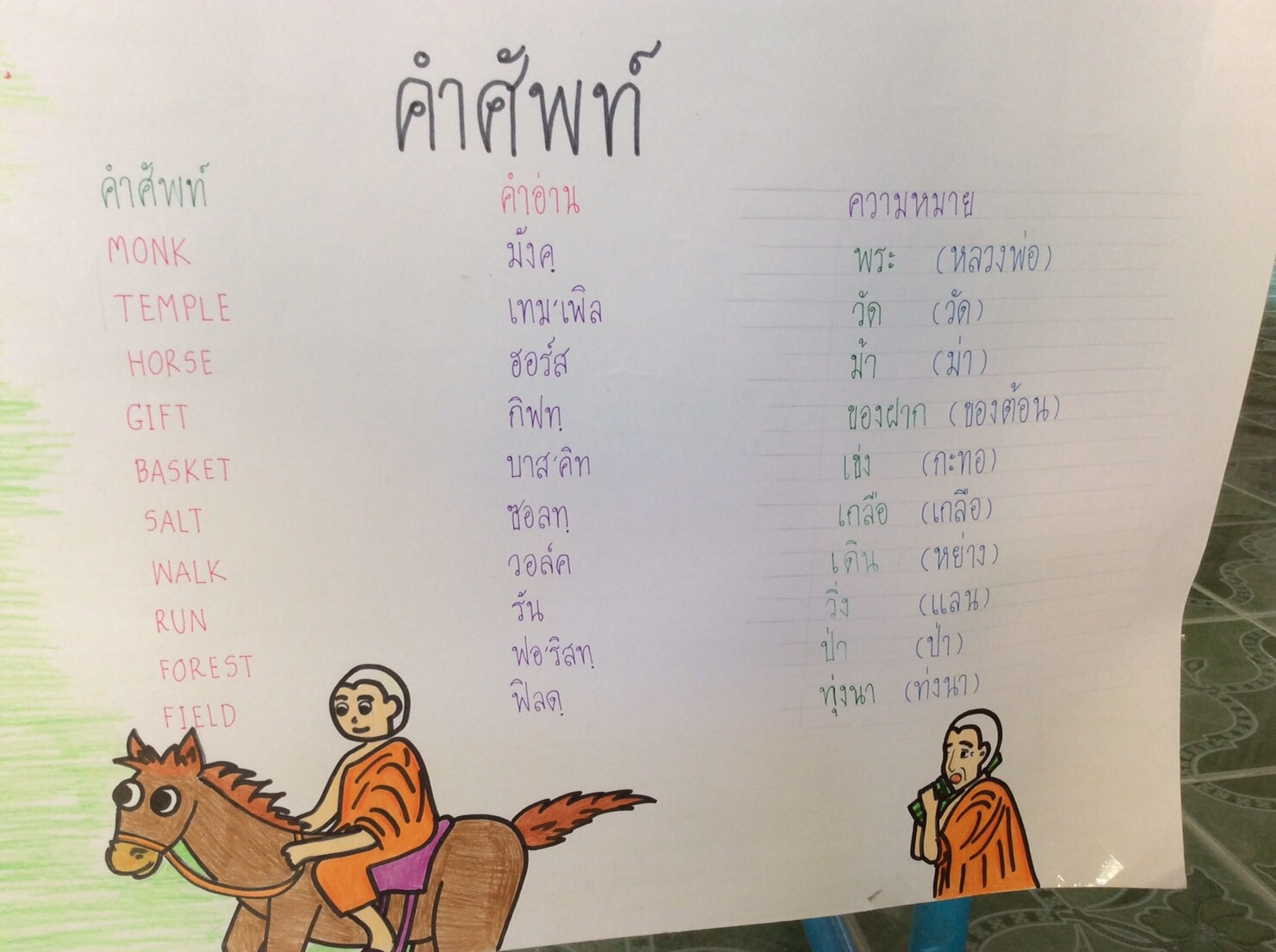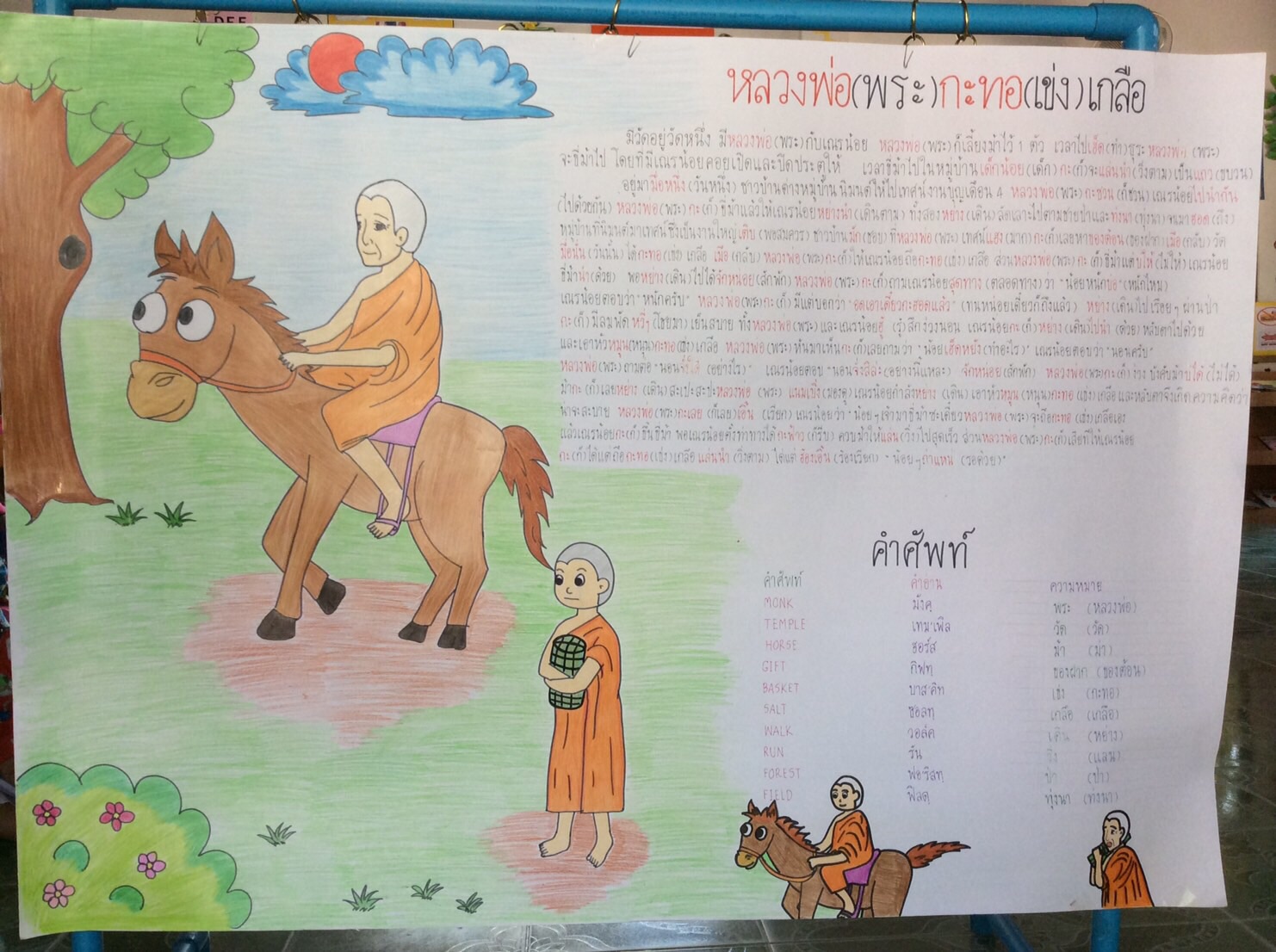 เณรน้อย ตอบ "ครับ" แล้วพอเณรน้อยขึ้นม้าได้กะฟ้าว(ก็รีบ)ควบม้าให้แลน(วิ่ง)ไปสุดเร็ว ส่วนหลวงพ่อ(พระ)ก็เสียทีเณรน้อยกะ(ก็)ได้แต่ถือ กะทอ(เข่ง)เกลือ แลน(วิ่ง)ตาม หลวงพ่อ(พระ)ได้แต่ฮ้องเอิ้น(ตะโกนเรียก)"น้อยๆถ้าแหน่(รอด้วย)"