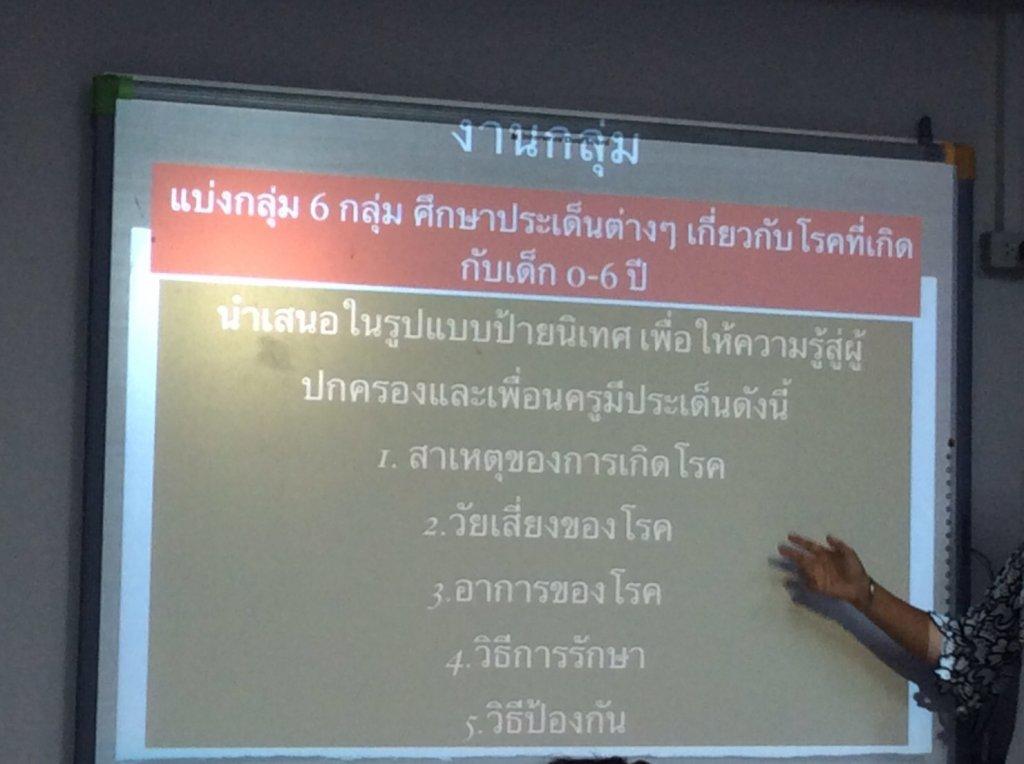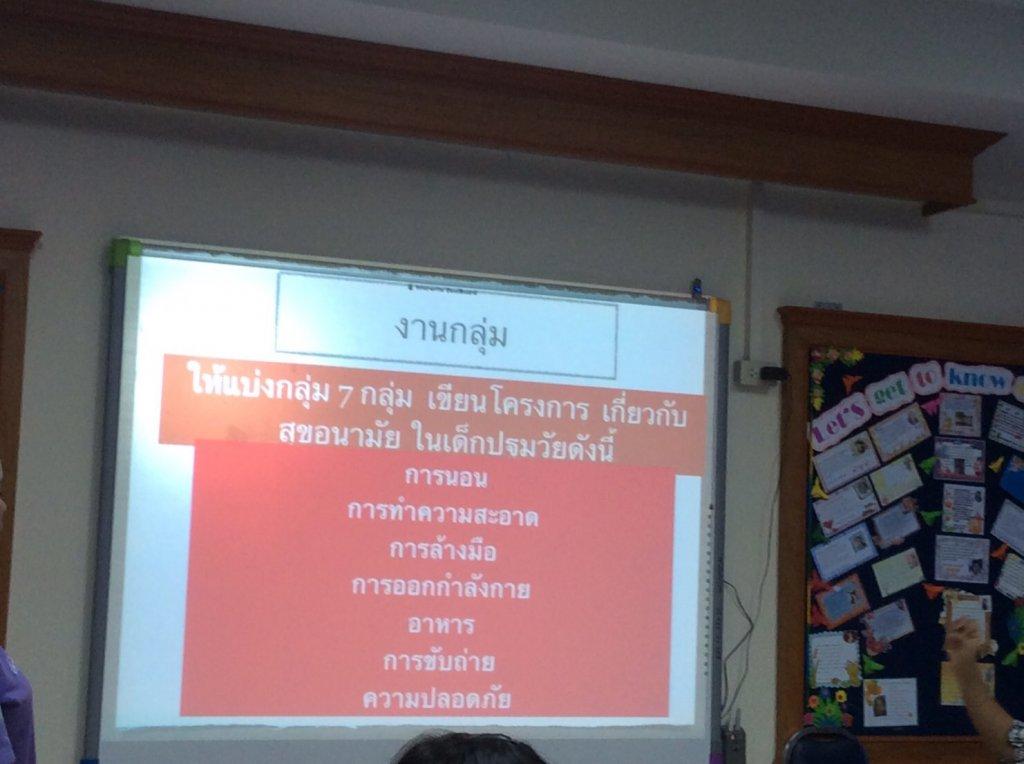 วิชาสุขอนามัย ความปลอดภัยและโภชนาการ เรียนรู้เกี่ยวกับการจัดการเรียนการสอนให้กับเด็ก ซึ่งให้นำแผนของโครงการสุขอนามัยไปสอนเด็กในศูนย์พัฒนาเด็กเล็กของตนเอง โดยสอดแทรกเนื้แหาความรู้ในโครงการที่ได้รับจากงานกลุ่มแทรกในกิจกรรมหลัก 6 กิจกรรม ก่อนเข้าสู่บทเรียน ครูควรกระตุ้นเด็กด้วยการใช้ประสาทสัมผัสทั้ง 5 เช่น คลำสิ่งของ เขย่าให้ฟัง ให้ดมกลิ่น เป็นต้น ครูต้องรู้จักเชื่อมโยง เปรียบเทียบ ให้เด็กแลกเปลี่ยนประสบการณ์โดยการเล่า