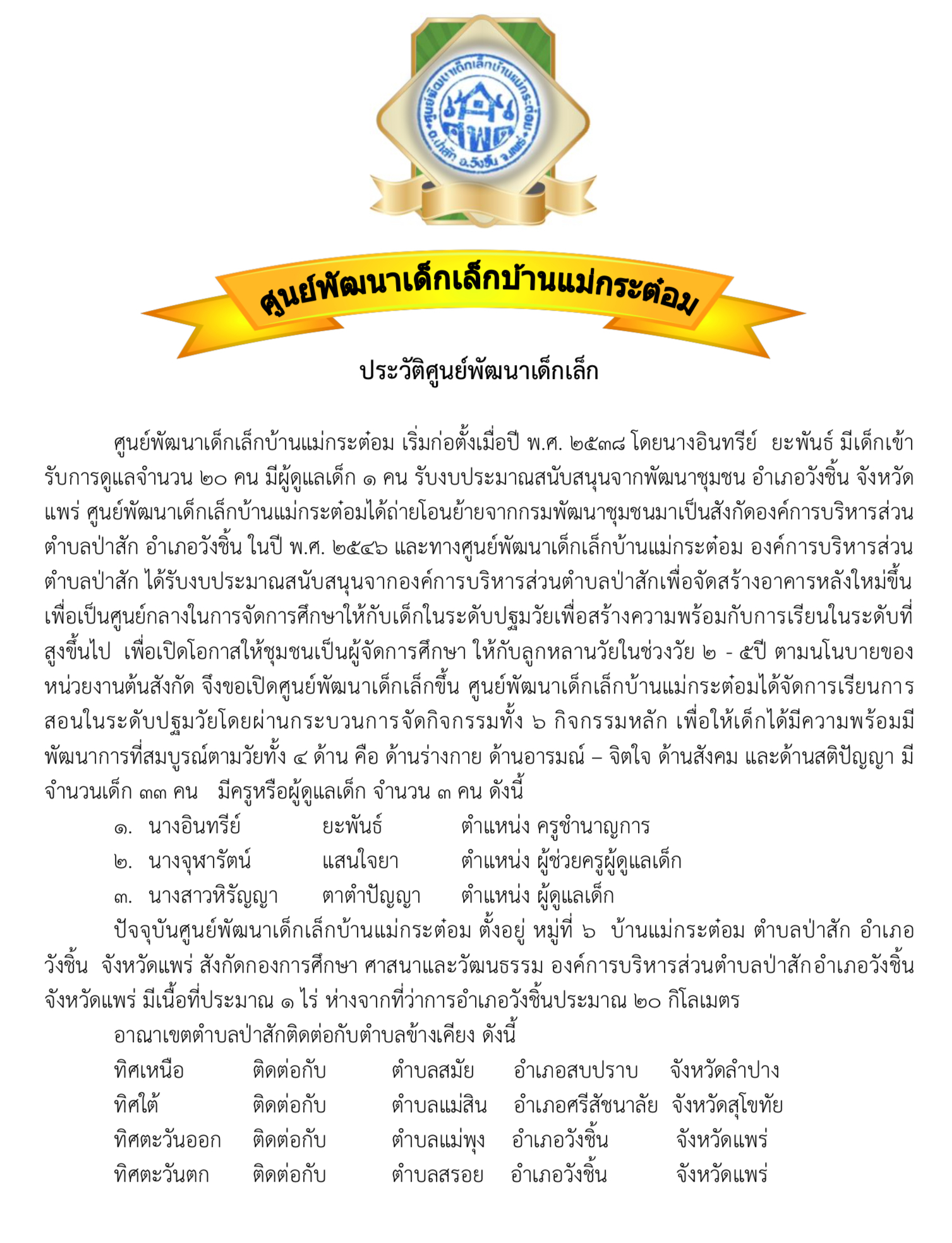 ศูนย์พัฒนาเด็กเล็กบ้านป่าสัก สังกัดองค์การบริหารส่วนตำบลป่าสัก อำเภอวังชิ้น จังหวัดแพร่ 54160